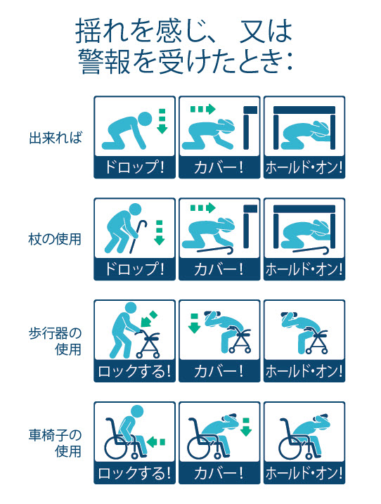 - 地震で津波が発生した場合は、Drop, Cover, then Hold On(地面に伏せ、身を隠し、何かに摑まる)。これにより、まず地震から身を守ることができます。