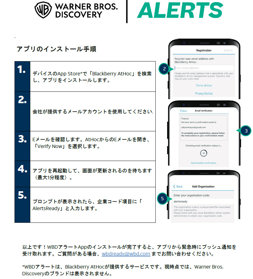 また、Blackberry AtHocが提供するWBD Alertsアプリをダウンロードすれば、緊急時や事業中断時に重要な情報をタイミングよく共有できます。WBD Alertsアプリは、世界中の政府機関から信頼されている業界最先端のプラットフォームを活用しており、携帯電話の電波塔が停止している場合でも機能します。仕事とプライベートの両方の携帯電話にアプリをダウンロードすることを推奨します。