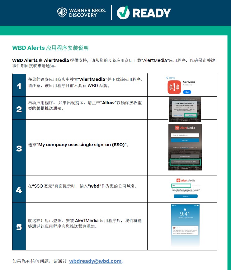 WBD Alerts 是公司的紧急通知系统。在发生影响您工作地点的紧急情况或中断时,WBD Alerts 可以提供关键信息、更新和资源,帮助您保持安全和知情。然而,只有当我们拥有您的最新联系信息时,我们才能联系到您。(别担心,WBD Alerts 只会在重大中断时联系您,当它真的很重要时。)